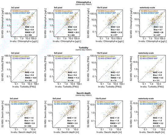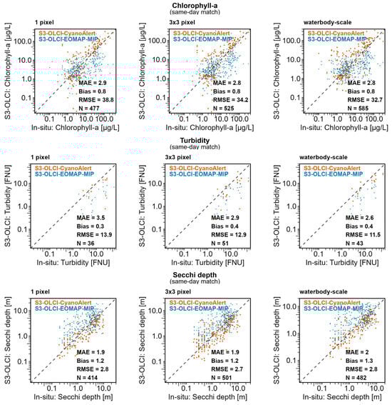 Overall performance of different spatial aggregations using the match-up dataset (same day) with MSI data processed by CyanoAlert (orange) and EOMAP-MIP (blue). Scatterplots are shown in log-log scale with selected error metrics and the number of observations (both processors combined) for the three target variables of chlorophyll-a (top), turbidity (middle), and Secchi depth (bottom). The grey dashed line refers to the 1:1 line.