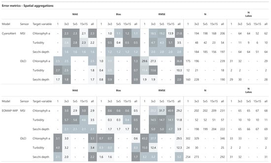 Overall performance of different spatial aggregations using the match-up dataset (same-day) with MSI and OLCI data separated, as in Figure 4, but the two processors EOMAP-MIP and CynaoAlert combined. Table shows selected error metrics, number of observations (matches) and number of waterbodies (N Lakes) for the three target variables chlorophyll-a, turbidity and Secchi depth. Dark-grey shades indicate poorer performance of variant, while lightest shades represent the best performance.