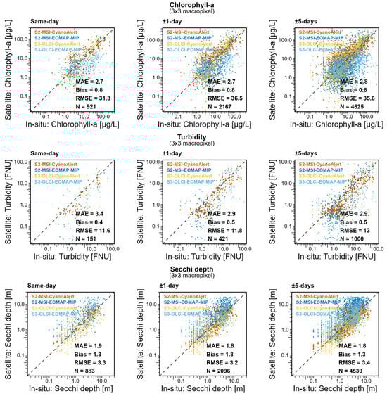 Overall performance of different temporal windows (left column, same day; middle column, ±1 day; right column, ±5 days) using the match-up dataset (3 × 3 macropixel) with MSI data processed by CyanoAlert (orange) and EOMAP-MIP (dark blue), and OLCI data processed by CyanoAlert (yellow) and EOMAP-MIP (light blue). Scatterplots are shown in log-log scale with selected error metrics and the number of observations for the three target variables of chlorophyll-a (top row), turbidity (middle row), and Secchi depth (bottom row). The grey dashed line refers to the 1:1 line.