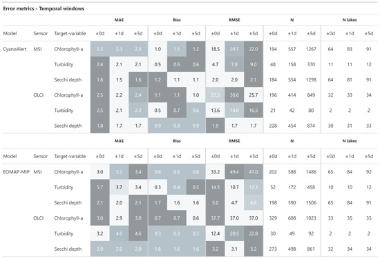Overall performance of different temporal windows using the match-up dataset (3 × 3 macropixels) with data of both sensors (MSI, OLCI) and processors (EOMAP-MIP, CyanoAlert) combined. The table shows selected error metrics, the number of observations (matches), and the number of waterbodies (N Lakes) for the three target variables of chlorophyll-a, turbidity, and Secchi depth. Dark grey shades indicate poorer performance of the variant, while the lightest shades represent the best performance.