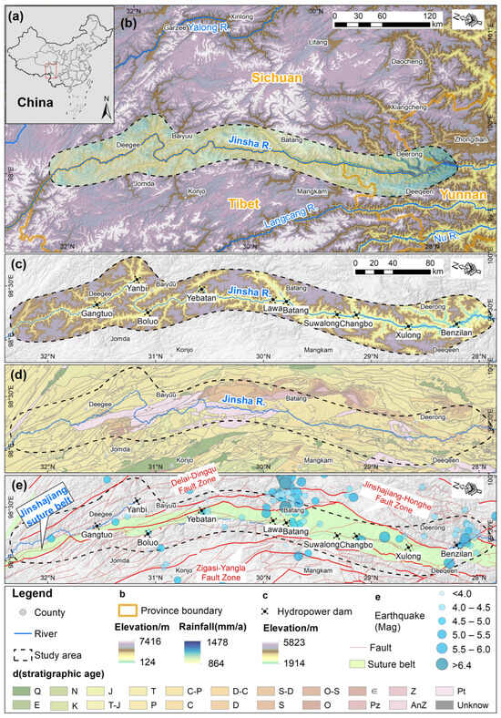 Map of the study area. (a) Location of the study area in China; (b) administrative divisions and rainfall map; (c) map of topography and hydropower stations; (d) stratigraphic map; (e) tectonic and seismic map. The topographic elevation data are from STRM, 30 m DEM; the rainfall data are from National Tibetan Plateau/Third Pole Environment Data Center (Reprinted/adapted with permission from Ref. [37]. 2020, Shouzhang, P.); the stratigraphic dataset is from the National Geological Archives of China; and the historic earthquake data are from USGS.