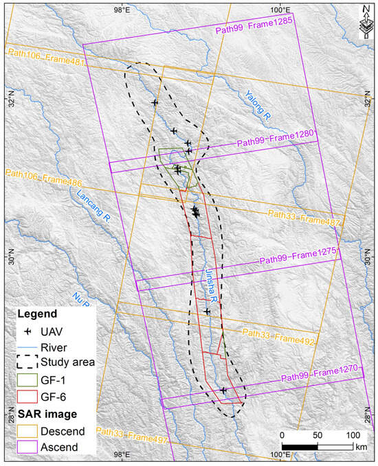 - Liu, X.; Zhao, C.; Zhang, Q.; Lu, Z.; Li, Z.; Yang, C.; Zhu, W.; Liu-Zeng, J.; Chen, L.; Liu, C. Integration of Sentinel-1 and ALOS/PALSAR-2 SAR datasets for mapping active landslides along the Jinsha River corridor, China. Eng. Geol. 2021, 284, 106033. [Google Scholar] [CrossRef]