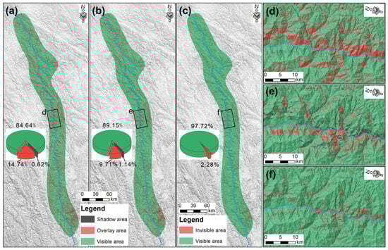 Results of visibility evaluation in the study area. (a) Ascending orbit data; (b) descending orbit data; (c) combined ascending and descending orbit data; (d–f) local zoomed-in view.