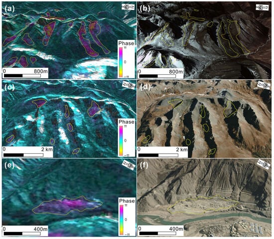 It is assumed that variables such as vegetation cover, topographical effects, and inaccuracies in data processing are fully eliminated. In addition to landslides, ground surface deformation frequently results from snow and ice melting, anthropogenic activities, etc. Consequently, the deformation region identified by stacking-InSAR technology should not be immediately regarded as a landslide. We excluded three types of non-landslide deformations observed in the optical satellite images. The first type was the deformation resulting from the melting of snow and ice, which was evident as a clustered strip area in high-elevation regions (generally greater than 4500 m) with steep gradients (Figure 6a,b). The second type of deformation involved dispersed small-scale changes. This included the source area of a debris flow (Figure 6c,d), seasonal changes on the surface due to variations in the water content of the loose sediment, and alterations to the ice layer on the lake surface, among others. The third type of deformation was caused by human engineering activities, primarily targeting construction sites with low-relief topography and gentle slopes (Figure 6e,f).