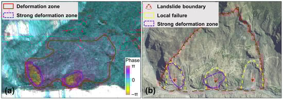 After removing non-landslide deformation, the focus of this study was on the deformation caused by active landslides. Nonetheless, it is important to note that the deformation boundary could not be directly applied as the landslide boundary since the InSAR technique may detect only a section of the landslide, which does not represent its complete shape. For instance, we used the stacking-InSAR technique to acquire a stacking phase map of the landslide in Guxue village. This highlighted two elliptical and strong deformation zones (Figure 7a). We also discovered that the slope on which Guxue village is situated appeared to be a complete ancient landslide stack upon examination of the optical satellite image (Figure 7b). Ultimately, we delineated the boundary of the Guxue landslide and identified the strong deformation zone detected through InSAR as an ancient landslide reactivation. Therefore, it is necessary to define the boundaries of landslides using optical satellite imagery.