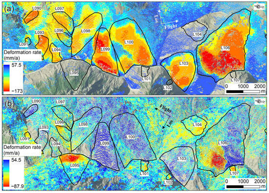 Average annual deformation rate for a representative region. (a) Deformation rate of ascending images; (b) deformation rate of descending images.