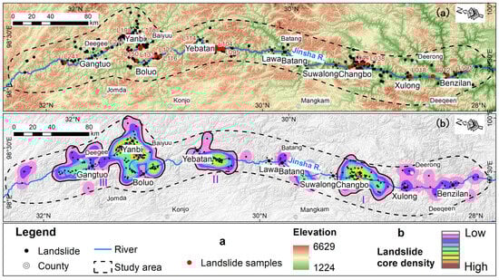 Map of active landslide identification. (a) Basic spatial distribution characteristics; (b) Non-uniformed spatial distribution and landslide concentration zones.