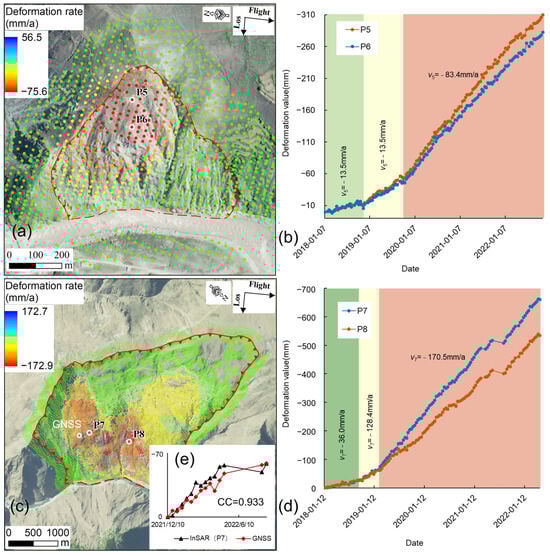 (a) Descending SBAS-InSAR map of L018; (b) time-series deformation curves at points P5 and P6 (the background color gradually transitions from green to red, indicating an increase in deformation rate; below is the same); (c) ascending SBAS-InSAR map of L106; (d) time-series deformation curves at points P7 and P8.