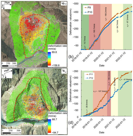 (a) Ascending SBAS-InSAR map of L116; (b) time-series deformation curves at points P9 and P10; (c) ascending orbit SBAS-InSAR map of L122; (d) time-series deformation curves at points P11 and P12.
