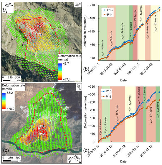 (a) Ascending track SBAS-InSAR map of L093; (b) time-series deformation curves at points P13 and P14; (c) ascending track SBAS-InSAR map of L197; (d) time-series deformation curves at points P15 and P16.