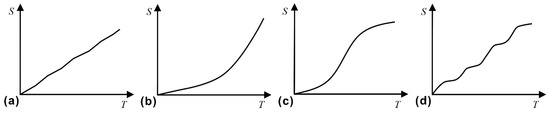 Classification of active landslide by time-series curves. (a) Linear-type landslide; (b) upward concave-type landslide; (c) downward concave-type landslide; (d) stepped-type landslide.