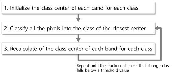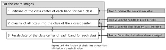 Because unsupervised classification is generally assumed to be a preprocessing task, in some cases, when repeatedly performed using various parameters on multiple images, it is strongly expected to require less processing time in a fully automatic method. However, computing-intensive methods are still likely to be relevant to the attainment of acceptable results. For example, k-means clustering, a de facto standard for unsupervised classification algorithms, is implemented in prevalent remote sensing software such as ENVI, Erdas Imagine, and SNAP. It is also implemented through extensions or plugins in GIS software such as QGIS and ArcGIS. Due to its simplicity and efficiency in clustering a large dataset, the k-means clustering algorithm is still popular and widely used in relevant studies in native and further modified forms [,,,,,,,,,]. K-means clustering is composed of multiple loops and may take hours depending on the volume of images and input parameters. Nevertheless, when applied to multiple images, resulting classes would not be compatible among the images because the method would lack pre-trained class signatures. Therefore, improvements are needed to increase processing speed and apply to series of images acquired from recent satellite missions.