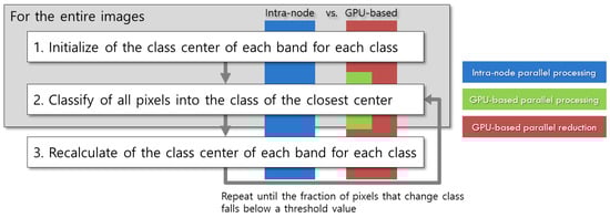 Initializing and updating class centers requires more complex designs be used for GPU-based parallel processing. Initialization requires searching the minimum and maximum values of all pixels, and updating requires summing all pixel values for each band of each class along with the counts of the pixels in each class. This kind of operation utilizes an array of numerous values to produce a single output and is referred to as “reduction”. In the intra-node parallel processing, data can be divided into several sub-sections, and each section can be serially reduced by each CPU core. Here, a serial reduction is defined to iterate through the entire array, performing the reduction on pairs of elements, and updating the accumulator until the result is obtained. However, this approach is not well suited for the massively parallel architecture of a GPU. Because each ALUs is not fast as a CPU core, it should be applied to finer pieces of tasks. Thus, a parallel reduction is conducted in the fashion that each ALU performs a summation or logical operation for finer entities. This procedure is iteratively performed for the results until a single result is derived. However, as the iteration goes on, the number of ALUs participating in the operation decreases exponentially. It is important to make as many ALUs still participate in the reduction. Parallel reduction has been sufficiently studied to enhance procedural efficiency based on CUDA []. In this study, sequential addressing, a middle-optimized parallel reduction among the relevant approaches (Figure 5), was applied to the following procedures in Figure 6.
