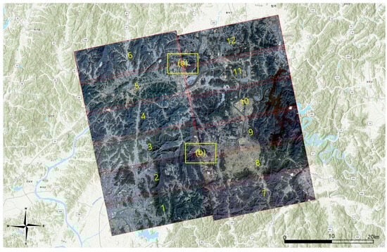 Placement of 12 PlanetScope images (Enlargements of (a) and (b) are in Appendix A, and location names are in local terms.)