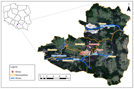 The limited river system in the Olkusz region is attributed to intense groundwater drainage and specific geological characteristics. The research area falls within the Biała Przemsza River Basin, at the confluence of the Sztoła River, nourished by underground waters from the Baba River. Waters downstream from mining discharge points maintain a quality rating of very good or good. Despite pronounced mining and metallurgical activities related to zinc and lead ores, the study area holds significant natural value. Protected zones include areas within the Kraków Valleys Landscape Park and the Eagles’ Nests Landscape Park, along with their buffer zone. The selection of the study area was influenced by the presence of a depression cone, and additionally, the western part was extended to incorporate the municipality of Sławków because of the Sztoła River’s mouth location [45].
