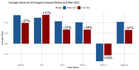 Figure 3. Average values for indices calculated for the periods 2017–2021 and 2022–2023.