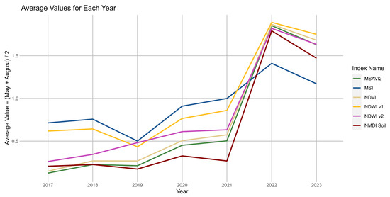 Figure 4. Average values for indices for each of the analyzed years (inverted values for MSAVI2, NDVI, and NDWI (I variant)).