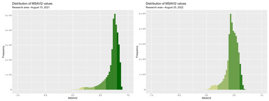 Figure 10. Histograms for MSI comparing the values of this index between 15 August 2021 and 25 August 2022.