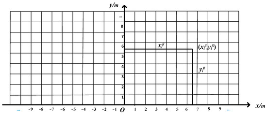Upon obtaining the first frame of local coordinates from the radar, with the starting point of the radar’s movement as the origin of the global coordinate system, the measurement azimuth axis in the local coordinate system is taken as the x-axis of the global coordinate system, and the measurement distance axis in the local coordinate system is taken as the y-axis of the global coordinate system. Let the grid coordinate in the global coordinate system be denoted as . represents the coordinates of the distance axis measured in the global coordinate system of the ith radar frame, and denotes the coordinates of the azimuth axis measured in the ith frame, with the unit being meters. The occupancy grid map constructed by the millimeter-wave radar SLAM front end in the global coordinate system is called the global grid map, and the points in it are referred to as grid points. The global coordinate system diagram is shown in Figure 2.