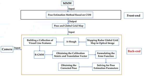 Existing radar and visual fusion SLAM systems often integrate both the front end and the back end. Current SLAM front-end frameworks mainly fall into three method categories: feature matching based, correlation based, and point-cloud registration based. Algorithms, such as CSM [2], which are representative of front-end pose estimation, as cited in [3], can achieve self-pose estimation and map the surrounding environment. However, due to the observation errors of the radar and coordinate transformation errors during the pose estimation process, there is an accumulated error over a prolonged measurement period. This causes the pose trajectory to gradually deviate in a direction perpendicular to the distance. Therefore, back-end optimization is necessary to correct the long-term cumulative errors produced by the front end.