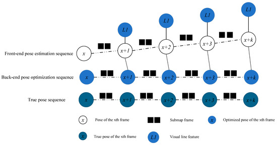 Figure 5 depicts the cumulative error of the millimeter-wave radar SLAM front end over an extended measurement period, resulting in a pose trajectory offset perpendicular to the distance direction. By introducing visual line features into the discontinuous time frame sequence, the map constructed before the addition of line features becomes a “submap”, and this moment is referred to as the “submap frame”. The radar’s own pose is corrected by compensating for the error in radar measurements.