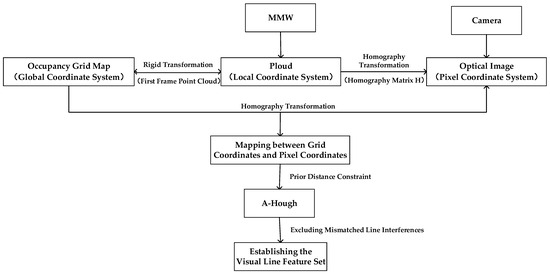 The second section of this paper introduces the coordinate system definition, related work, and a pose estimation framework that integrates visual and radar line features. The third section describes the principle of the adaptive Hough transform line detection method based on the projection of the radar’s prior grid map, establishing the visual line feature set. The fourth section presents the principle of the GMM clustering model based on RCS. The fifth section is dedicated to experiments and result analysis, where several comparative experiments demonstrate the effectiveness of the method. The final section offers a summary.
