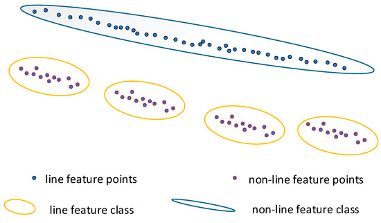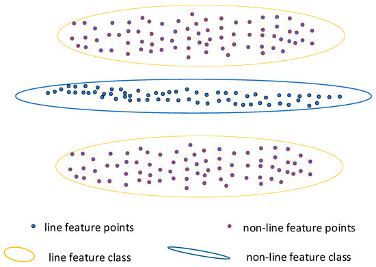 Since this paper mainly focuses on the region in the global grid map that matches with the visual line features, during the R-GMM clustering, this region is set to cluster into three categories. Centered around the line feature region, each side of the line feature is clustered into one category. A schematic diagram is shown in Figure 8.
