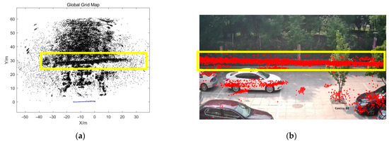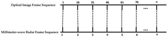 From the correspondence between the global grid map projected onto the optical image frame sequence, it is known that there is a time difference between the two frame sequences. To simulate harsh conditions and obtain discontinuous line features, only one optical image is incorporated into the back-end framework proposed in this study during experimental verification. The relationship between the optical image and the millimeter-wave radar frame sequence is illustrated in Figure 10.