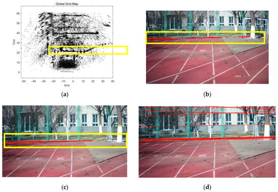 Experimental results for Moving Scene: (a) global grid map; (b) projection of the global grid map onto the optical image; (c) results of A-Hough; (d) results of Hough transform line detection method.