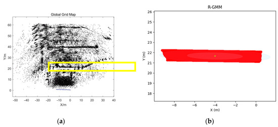 However, in the global grid map, due to the clutter points having similar positional features to the “points of interest”, the GMM might treat these clutter points as significant data features, allocating one or more Gaussian distributions to fit these clutter points. This is because the GMM’s goal is to minimize the overall error, and the clutter may dominate much of the data. At the same time, the points forming line features might be sparse in comparison to the entire dataset. Thus, when the GMM attempts to fit the large number of clutter points with Gaussian distributions, it might “overshadow” the sparse line features.