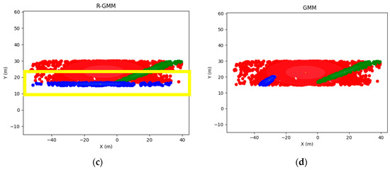 Traditional clustering approaches struggle to address the issue of the influence of clutter points. Hence, this paper proposes the incorporation of RCS as a weight to distinguish between line feature points and clutter points, increasing the distance in the ellipsoidal feature space, ensuring points with similar structures cluster together. A schematic diagram is shown in Figure 7. The blue box represents the clustering results after incorporating RCS, while the yellow box shows the GMM clustering results. Both algorithms cluster the same line.