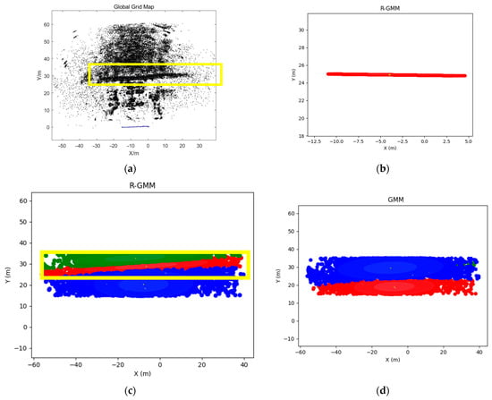 Experimental results for Moving Scene: (a) global grid map; (b) clustering results for the visual line feature set; (c) results from R-GMM clustering; (d) results from GMM clustering.