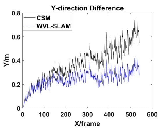 From Figure 16 and Figure 17, it can be observed that the pose estimation method based on CSM tends to offset in the direction perpendicular to the distance (in the Y-direction) during prolonged measurements, resulting in significant deviation from the ground truth. In contrast, the pose estimation results of the VRL-SLAM method proposed in this paper will have a certain offset. Over prolonged measurements, as the back-end framework is optimized, the cumulative error decreases, causing the pose trajectory to get progressively closer to the ground truth and gradually become smoother.