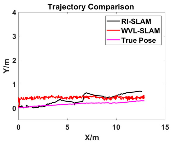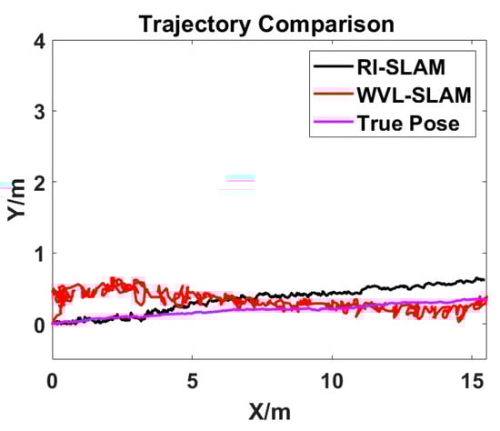 RMSE is used to evaluate the effectiveness of the RI-SLAM and VRL-SLAM algorithms. The calculation formulas for the RMSE in the X-direction, Y-direction, and angle are consistent with Equation (21), Equation (22), and Equation (23), respectively. The calculation results are shown in Table 2.