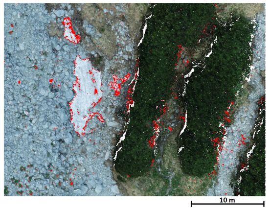 The classification errors in Data 2 are repetitive and very similar throughout the image; hence, we only show detail in Figure 5. Similar to the previous dataset, the erroneous classification can be observed on the borders of classes; in addition, the gaps between neighboring concrete panels were also incorrectly classified here.
