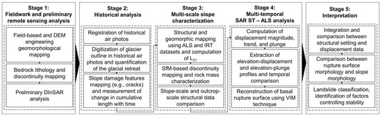 This research follows the workflow summarized in Figure 2. The workflow comprises five stages: field characterization, historical analysis, multi-scale (i.e., slope and rock mass) characterization, SAR data processing, and an integrated interpretation. Alyeska Pipeline Service Company provided ALS for 2014 and 2016 and access to the site for ground-based field and remote sensing characterization. Table 1 provides a summary of the remote sensing datasets used in this research, together with relative information on the source, scale, and resolution.