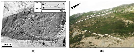 Overview of the Fels Glacier valley slope. (a) Hillshade map derived from the ALS dataset. Profile A-A’, plotted in the inset, extends across the northwest boundary of the landslide area and intersect the geomorphic steps discussed in the text. (b) Photograph (view to the northwest) taken from a helicopter. Line I is the upper limit of the rotational sliding instability of the fast-moving toe. Lines II and III mark scarps at the northwest boundary of the landslide. Line IV delineates a gully that marks the east boundary of the landslide.