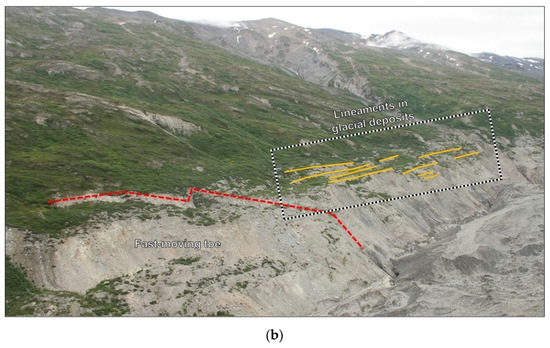 The Denali Fault is an active, right-lateral strike-slip fault that follows the Canwell Glacier valley south of the Fels Glacier valley (Figure 1a). An MW 7.9 earthquake occurred on this fault on 3 November 2002, accompanied by up to 5.3 m of right-lateral slip, as estimated within nearby Delta River valley [36,37], and hundreds of rock avalanches, rockslides, rotational slides, and debris avalanches within the epicentral area [38,39]. The area of the landslide was also affected by ground shaking during the 1964 MW 9.2 Good Friday earthquake, which had a source beneath Prince Williams Sound about 320 km to the WSW. In this case, the ground motions were considerably attenuated over a large distance from the earthquake source [40].