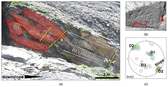The results from the remote sensing outcrop-scale analysis display some agreement with field data reported by [32], including an average foliation orientation of 27°/207° and a sub-vertical northwest-dipping set (referred to as J1) that correlates with D2 in this study. Reference [32] also reported two minor sub-vertical north- and northeast-dipping discontinuity sets in the west part of the landslide area; however, we did not observe them in the investigated outcrop. The observed differences are likely due to the greater number of localities investigated by [32], both within and outside the landslide area. In this study, only rock outcrops outside the slide area were investigated.