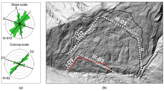 (a) Rosette diagrams showing slope-scale lineaments and the outcrop-scale discontinuities. (b) Potential correlation between the discontinuity sets identified during the outcrop-scale analysis (D2-D3) and the lineaments (I-III) delineating the boundaries of the landslide (dotted black line, excluding the low displacement rate area) and the fast-moving toe (red dotted line).