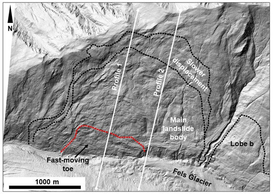 Two adjacent and distinct areas of active slope deformation, separated by a prominent gully, referred to as “Lobe A” and “Lobe B”, exist within the Fels Glacier valley (Figure 1a; [32]. The Fels landslide corresponds with the area of Lobe A, which, compared to Lobe B, is characterized by significantly higher deformation rates. Lobe A also displays a spatially varied distribution of displacement rates. The western part of the lower slope displays evidence of active instability, mainly in the form of steep scarps, and is hereafter referred to as “fast-moving toe” (Figure 1b). The central part of the landslide has spatially homogeneous displacement rates. In comparison, the upper part displays an abrupt decrease in displacement rates (upper right inset in Figure 1a). The north slope of the Fels Glacier valley dips about 20–30° SSW, increasing to 40–50° near the Fels Glacier. The landslide has an area of 2.3 km2 and extends down to the toe of the glacier, about 3 km above the mouth of the Fels Glacier valley. It has a measured length of 1400 m in the E-W direction and 1600 m in the N-S direction (between elevations of 920 and 1490 m above sea level (a.s.l.)).