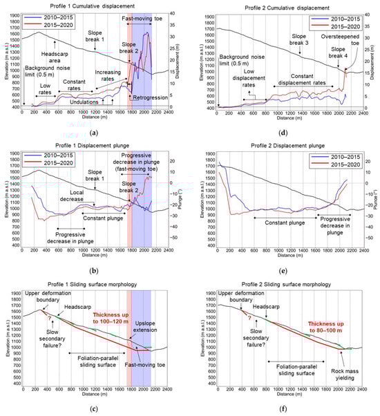Summary of profile analysis and VIM failure surface reconstruction. (a) Cumulative displacement (2010–2015 and 2015–2020) along profile 1. (b) Displacement plunge (2010–2015 and 2015–2020) along profile 1. (c) Failure surface reconstruction along profile 1 based on plunge and displacement data. (d) Cumulative displacement (2010–2015 and 2015–2020) along profile 2. (e) Displacement plunge (2010–2015 and 2015–2020) along profile 2. (f) Failure surface reconstruction along profile 2 based on plunge and displacement data. Blue and red zones in the plots indicate, respectively, the extent of the fast-moving toe in the 2010–2015 ST dataset and the upslope extension noted in the 2015–2020 dataset.