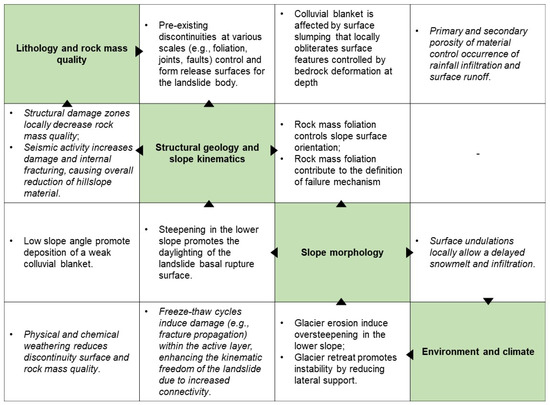 Interaction matrix summarizing the role of selected principal controlling factors (green cells along the main diagonal) on the stability and evolution of the Fels landslide. Italic font indicates interactions that are assumed but have not been investigated in detail in the present research.
