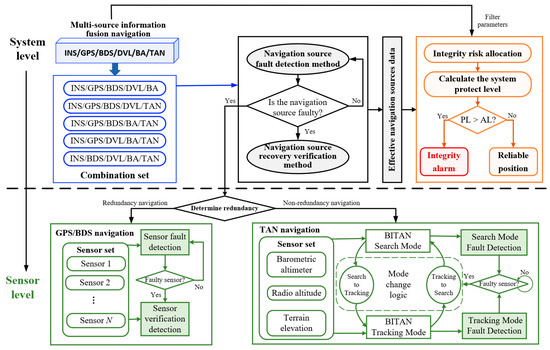 To address the issue of integrity monitoring for a multi-source information fusion navigation system, a theoretical framework of two-level integrity monitoring is proposed. Firstly, at the system level, a system-integrity-monitoring method based on the Kalman filter weighted least-squares form is established to detect and isolate faulty navigation sources. Secondly, at the sensor level, considering the redundancy of the faulty navigation sources, this paper presents the design of a multi-mode comprehensive fault-detection method for non-redundant navigation sources. Additionally, an extended-dimension matrix optimized sensor-fault detection and verification method for redundant navigation sources is proposed. Finally, integrity risk allocation criteria are established based on the effectiveness of navigation sources to calculate the system protection level and trigger integrity alarms. The two-level integrity-monitoring method was tested on a multi-source information fusion navigation system integrated with an inertial navigation system (INS), global positioning system (GPS), BeiDou satellite navigation system (BDS), Doppler velocity log (DVL), barometric altimeter (BA), and terrain-aided navigation (TAN). Test results demonstrate that the proposed method can effectively isolate the faulty navigation source within 10 s. Furthermore, it can detect the faulty sensors within the faulty navigation sources, thereby enhancing the reliability and robustness of the multi-source information fusion navigation system.