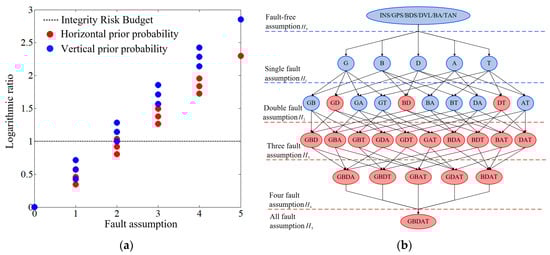 The logarithm of integrity risks under different fault hypotheses was calculated, as shown in Figure 2a. In Figure 2a, the black dashed line represents the situation when the prior fault probability is assumed to be equal to the integrity risk. A ratio less than 1 indicates that the probability of fault assumption occurrence is greater than the integrity risk, while a ratio greater than 1 indicates that the probability of fault assumption occurrence is less than the integrity risk. Therefore, for the multi-source information fusion navigation system INS/GPS/BDS/DVL/BA/TAN, regardless of whether the TAN system is updated or not, the fault assumptions that need to be monitored are all less than .