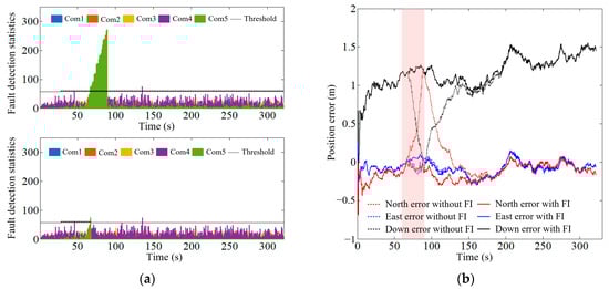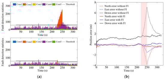 It can be seen from Figure 3a and Figure 4a that the detection statistics without FI for Com5 and Com2 significantly exceed the threshold, while the fault-detection statistics with FI are less than the threshold. This indicates that the fault-detection model design proposed in this paper can effectively detect the faulty navigation source. Comparing the position error curves without FI and with FI, it can be seen that if the fault is not isolated, the position error curve changes significantly, as shown in the red area in Figure 3b and Figure 4b.