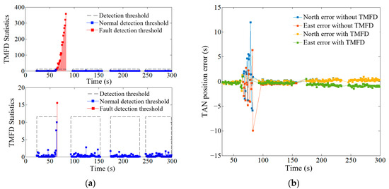 For the tracking mode, as it utilizes single-state Kalman filtering based on height measurement values, a failure in the radio altimeter sensor or barometric altimeter sensor directly impacts the positioning performance. The proposed TMFD model was tested using Case 1 and Case 2 from Table 4. Table 10 displays the fault-detection time and RMSE values for TAN with and without TMFD. Figure 6 illustrates the TMFD results under Case 1, where the fault-detection statistics curve in Figure 6a shows the upper part as the result without TMFD and the lower part as the result with TMFD.