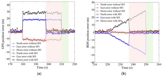 In addition, sensor integrity monitoring can significantly reduce the duration of navigation source failures, as depicted by the red areas in Figure 7. According to Table 11, the original recovery time of GPS simulation failures was 210 s, and the recognition time for sensor failures was 198 s. By isolating the faulty sensor, the recovery time of the navigation source was reduced by 12 s. The original recovery time of BDS simulation faults was 250 s, and the recognition time for sensor faults was 236.5 s. By isolating the faulty sensor, the recovery time of the navigation source was reduced by 13.5 s. The sensor verification function can rapidly recover the isolated sensor after the fault disappears, as shown in the green areas in Figure 7. The verification success time of the GPS faulty sensor was 215 s, and the verification success time of the BDS faulty sensor was 256 s. Compared with the original recovery time of the simulated faults, the two examples went through verification cycles of 5 s and 6 s, respectively, after the fault disappeared, and the isolated sensor could be reintegrated into the navigation source solution. The corresponding positioning accuracy was restored to the level before the fault.