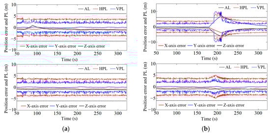 The effectiveness of the protection level calculated in this paper was tested under the simulation faults in Table 4. After the system stabilized, the system-protection-level results within the fault time under different fault cases were calculated, as shown in Table 14. Here, Case 0 represents the fault-free condition, μ represents the mean value, and Max represents the maximum value. Taking Case2 and Case4 as examples, the position error and protection-level curves are illustrated in Figure 8, where the upper part displays the result without FI, and lower part displays the result with FI.