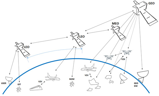 Autonomous remote sensing systems are finding their place in an increasing number of applications with a high number of users today, thanks to developing technology. Autonomous driving and advanced driver assistance systems [1,2], intelligent traffic control systems [3], accurate mapping with unmanned aerial vehicles (UAV) [4], and non-terrestrial networks (NTN) [5] can be given as examples of fifth-generation (5G) remote sensing applications. In Figure 1, the NTN and 5G communication scenario in a highly dense environment is given. In highly dense communication environments, where there are many vehicles, estimating the directions of the vehicles with high accuracy is important for traffic control. Therefore, remote sensing systems are required to suppress radio frequency (RF) interference signals. This enables the system to distinguish and track desired targets by processing received signals and ensures communication by transmitting signals at high speed. In such systems, seamless communication under rough environmental factors is required. These demands can only be fulfilled by employing smart antennas systems (SASs).